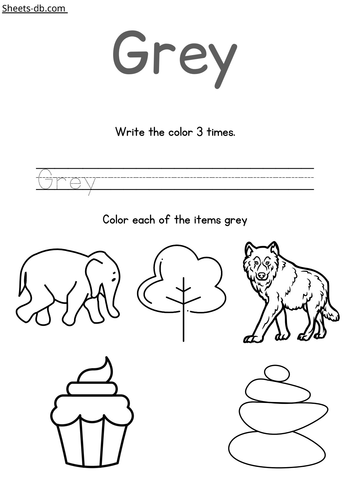 Each worksheet includes images that need to be colored according to the specified color. For example, in the “Grey” worksheet, children are asked to color objects like an elephant, wolf, and stones in grey. This enhances color association and creativity.