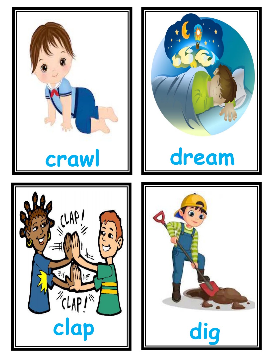 Each action verb is paired with a vibrant illustration to help learners visualize the word. For example, crawl is depicted with a crawling child, and dig with a person shoveling soil. These images enhance memory retention, especially for visual learners. - Beginner-Friendly Vocabulary: