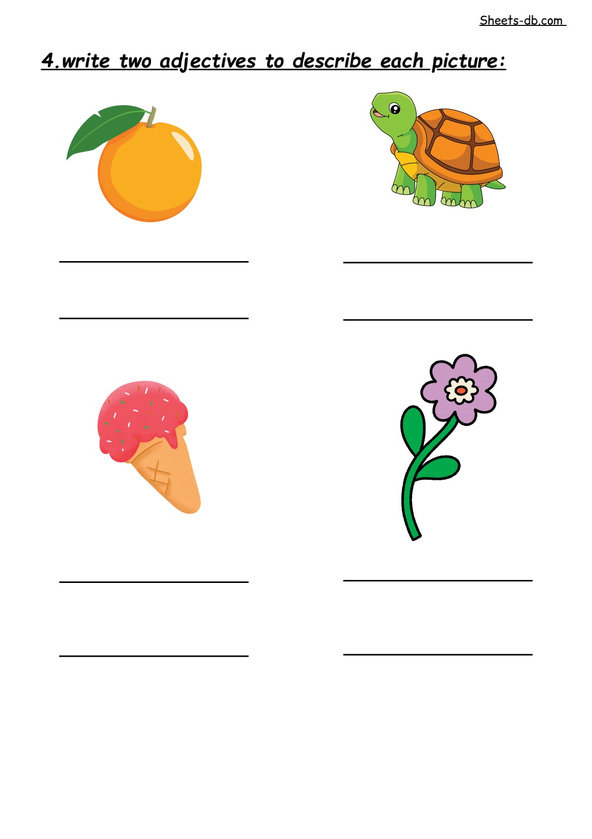 Students are asked to write two adjectives to describe each picture. This exercise fosters creativity and observation skills while reinforcing the importance of adjectives in everyday language.