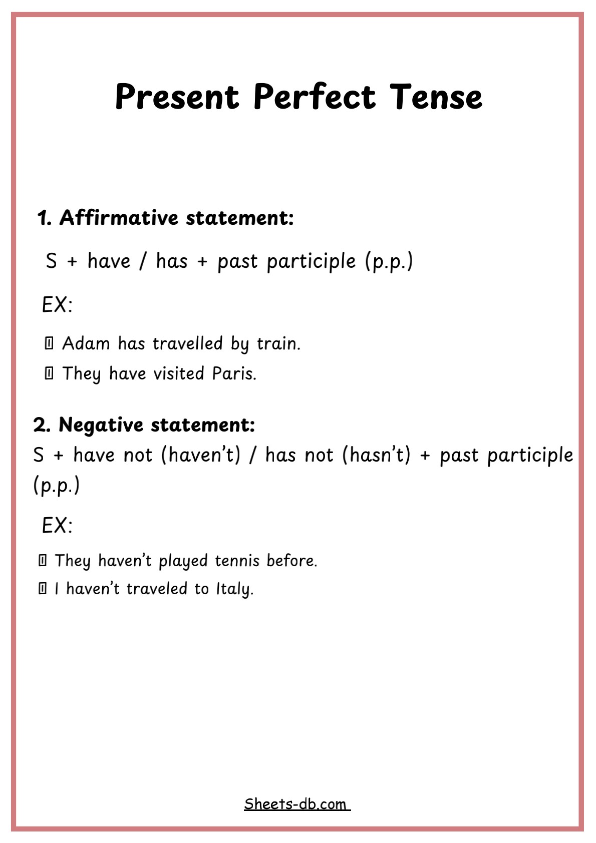 - Negative: Subject + have not (haven’t) / has not (hasn’t) + past participle (p.p.)
