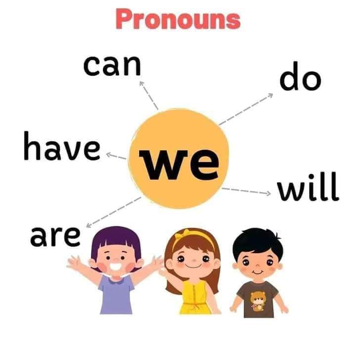 The poster cleverly illustrates how the pronoun “we” relates to other words commonly used in sentences. It shows auxiliary verbs and modal verbs such as “can,” “do,” “have,” “are,” and “will,” demonstrating how “we” can be used in various sentence structures. This approach helps children understand pronouns in context rather than in isolation.