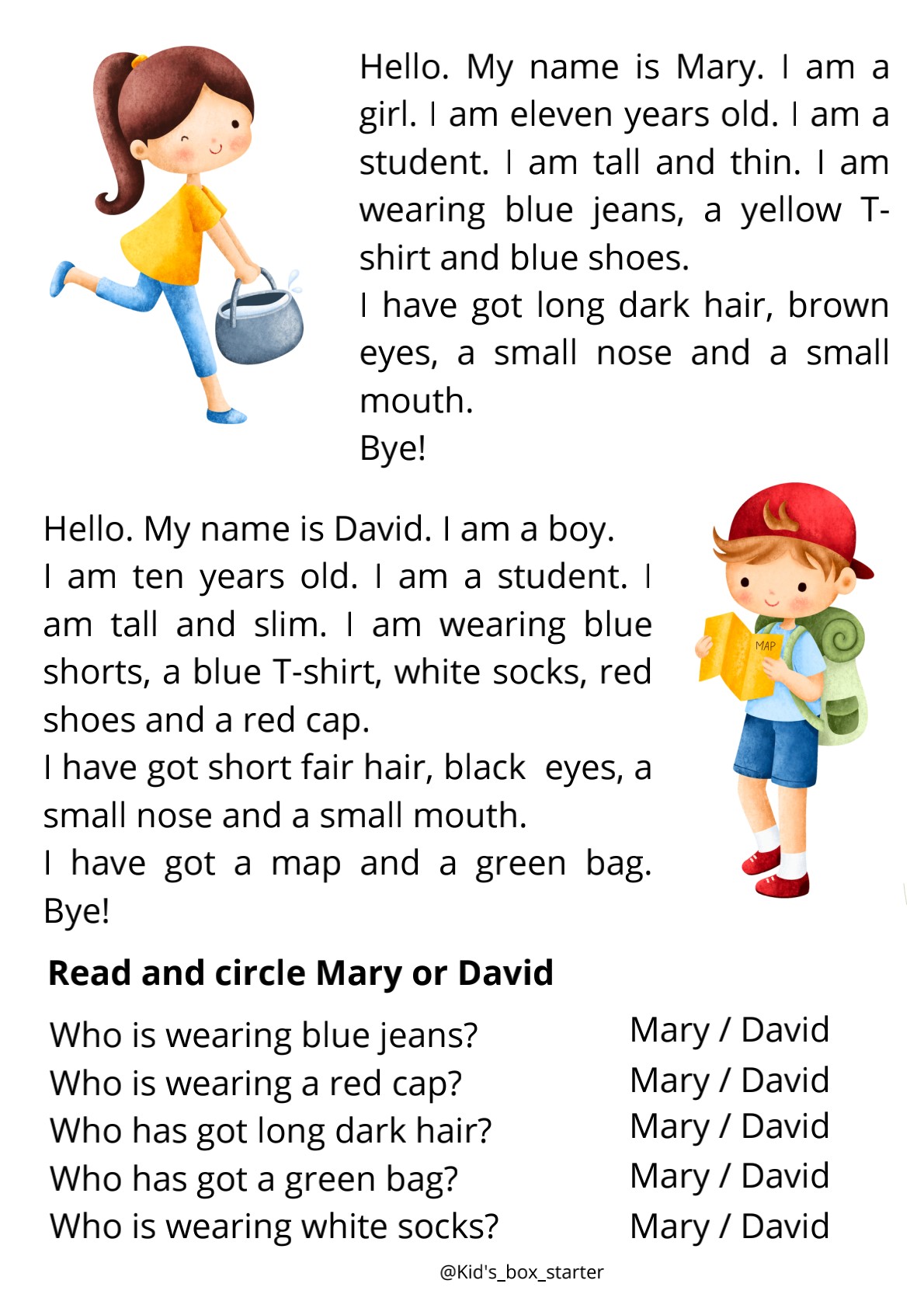 Learners read about different characters and their descriptions, then answer questions about them. For example:
