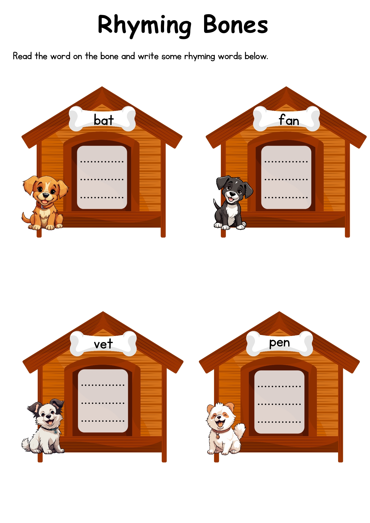 The Rhyming Bones worksheet presents words written on bone-shaped outlines. Children are encouraged to read each word and come up with rhyming words to write in the provided spaces. This hands-on exercise allows kids to explore word patterns, recognize sounds, and strengthen their vocabulary in a fun and interactive manner.