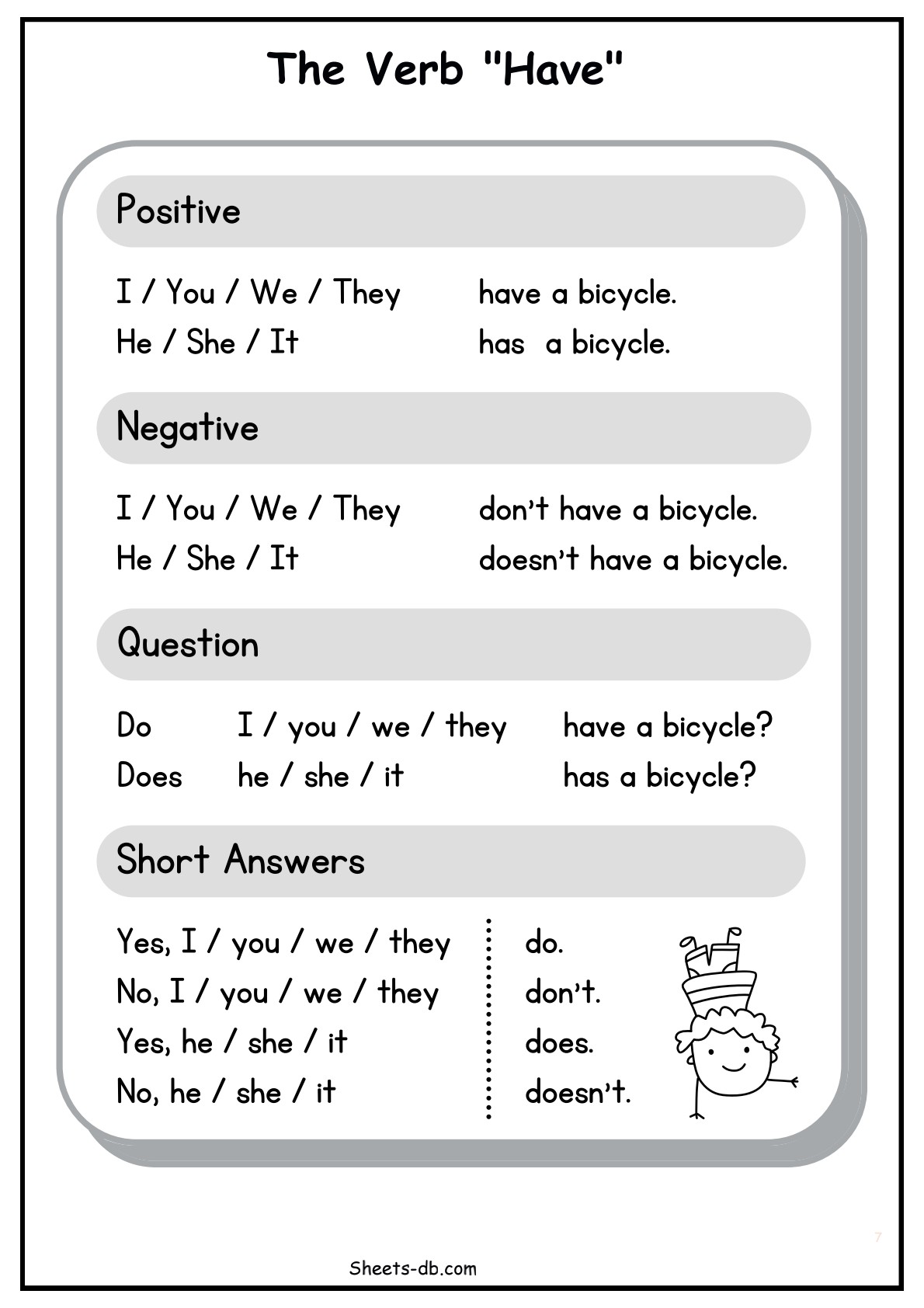 The worksheet introduces the positive and negative uses of “have” and “has,” showcasing their application in singular and plural subjects. Examples like:- Positive: “I have a bicycle.” / “He has a bicycle.”