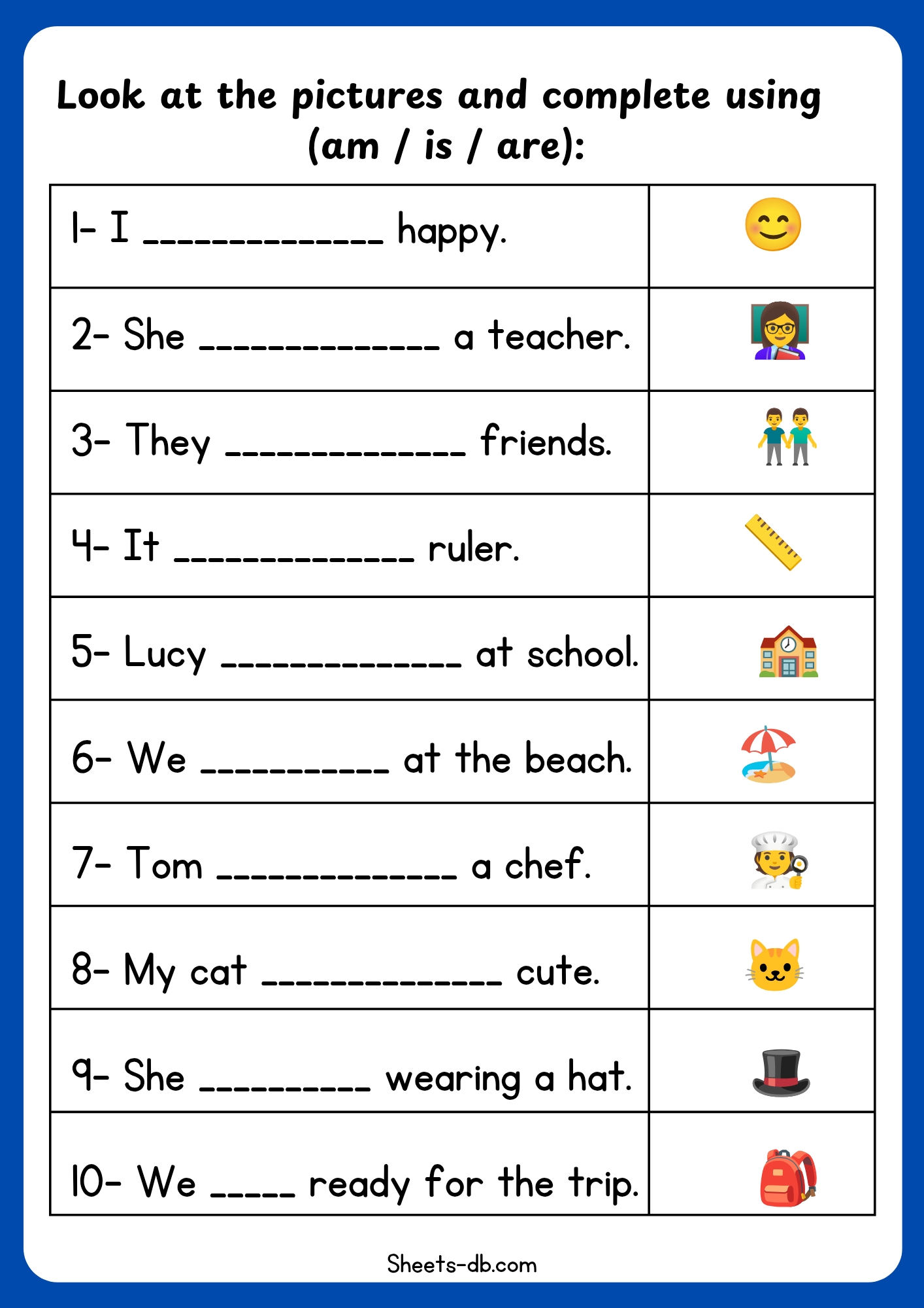 I created a simple worksheet to help my young students learn how to use “am,” “is,” and “are” correctly. This worksheet has sentences with blanks, and students fill in each blank with the right word.