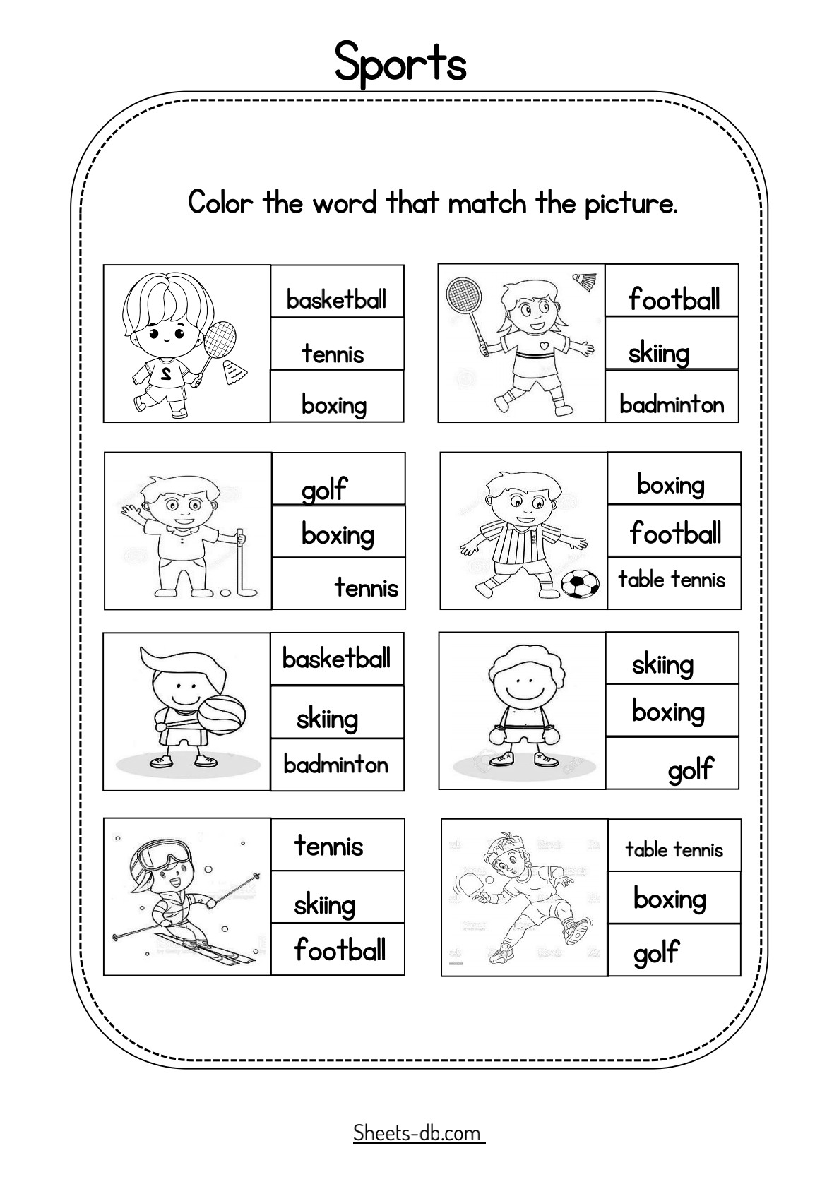 Sports are an important part of childhood. This worksheet introduces vocabulary related to various sports like tennis, basketball, boxing, badminton, skiing, golf, football, and table tennis. It encourages children to explore different activities and stay active.