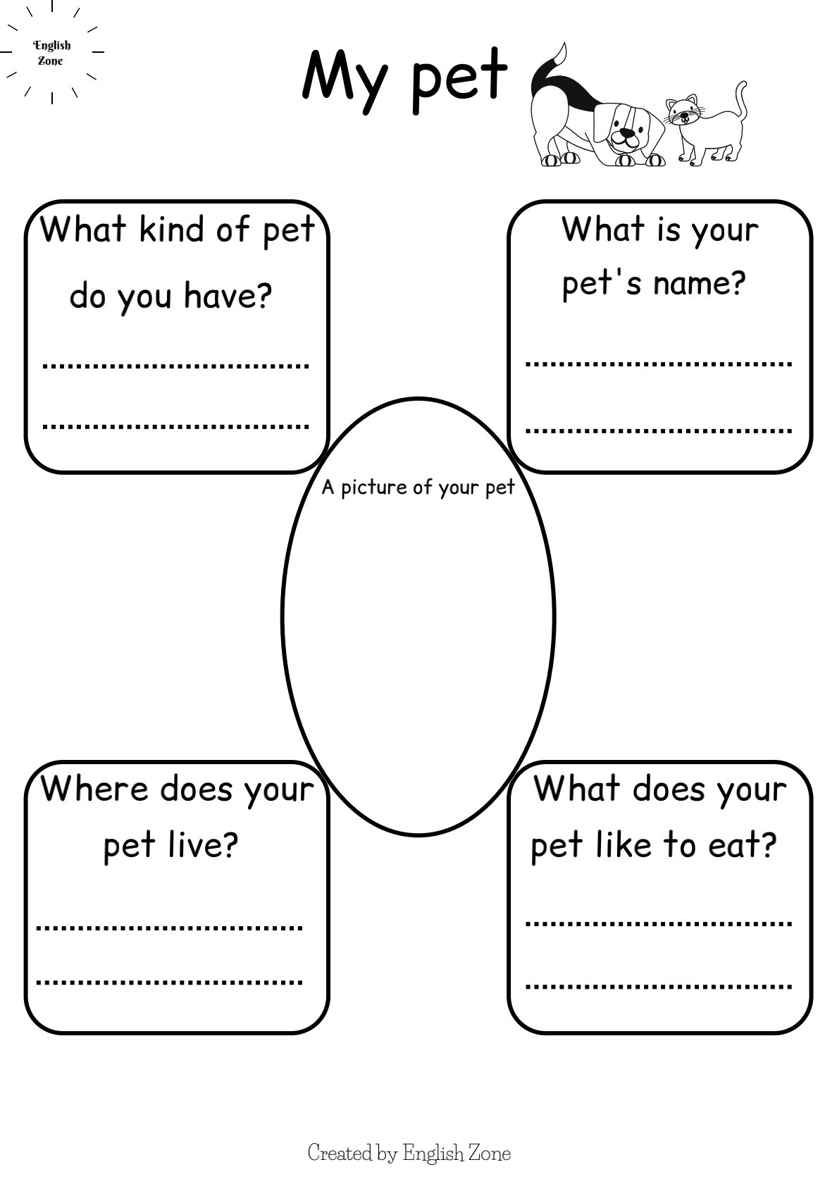 This section encourages children to write about their pet (or an imaginary one). They answer simple questions about their pet’s name, what it eats, and where it lives. There is also a space for them to draw a picture of their pet.
