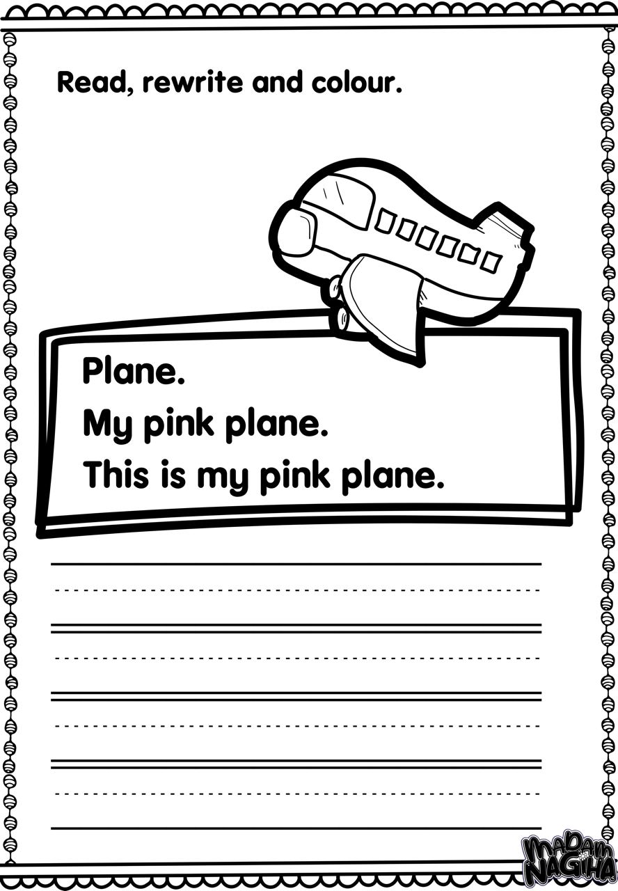 - Children read the sentence, rewrite it to practice handwriting, and then color the picture accordingly.